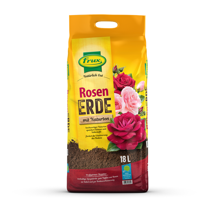 frux Rosenerde – die Pflanzerde für Rosen mit hohem Anteil an frischem Naturton und Struktur bildendem Rindenhumus. Besonders gut zum Pflanzen von wurzelnakten Rosen im Garten oder auch in Kübel geeignet. Mit allen erforderlichen Nährstoffen. Fördert das Anwachsen, die Weiterentwicklung und den Blütenansatz der Rosen.