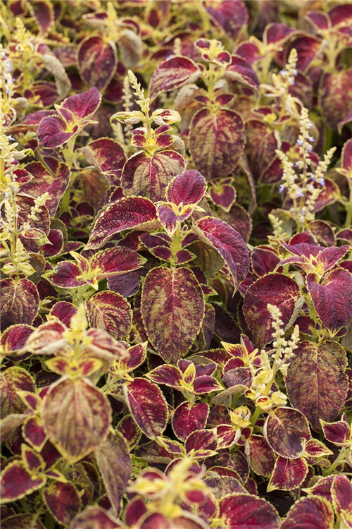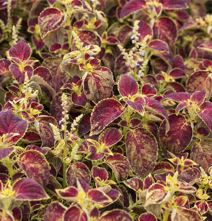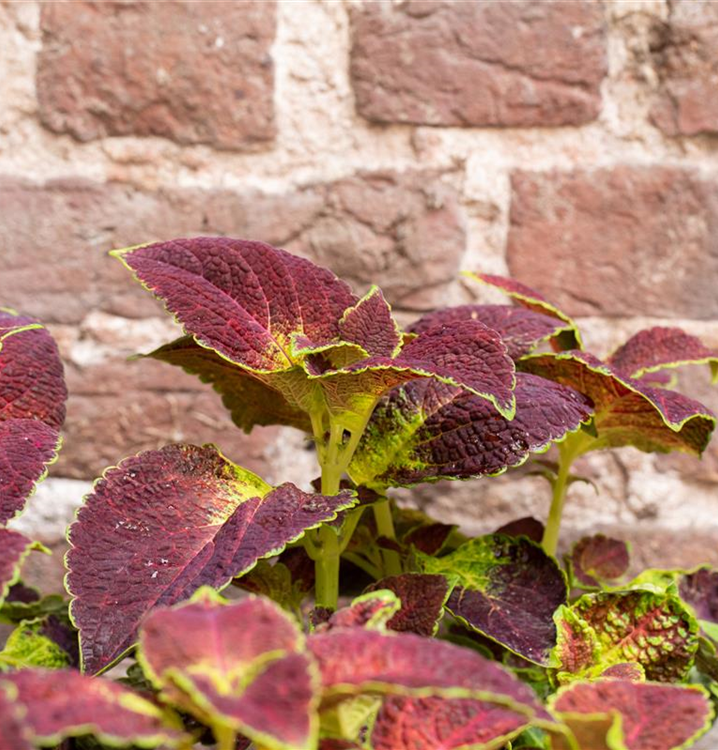Die Ziernessel 'Dipt in Wine' (Solenostemon) besitzt dekorative, dunkelrote Blätter. Sie sind spitz eiförmig und gebuchtet. Ein sonniger Standort und ein durchlässiges Substrat werden bevorzugt.