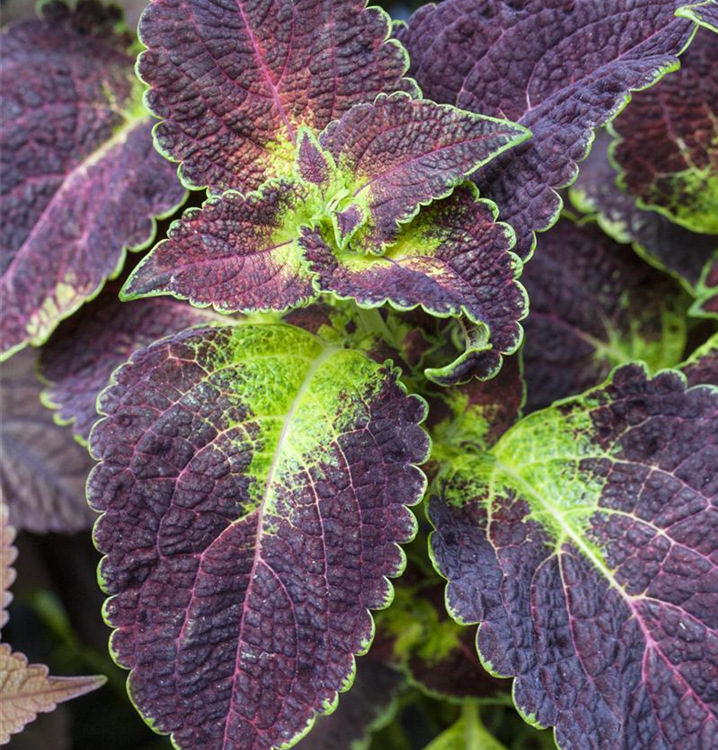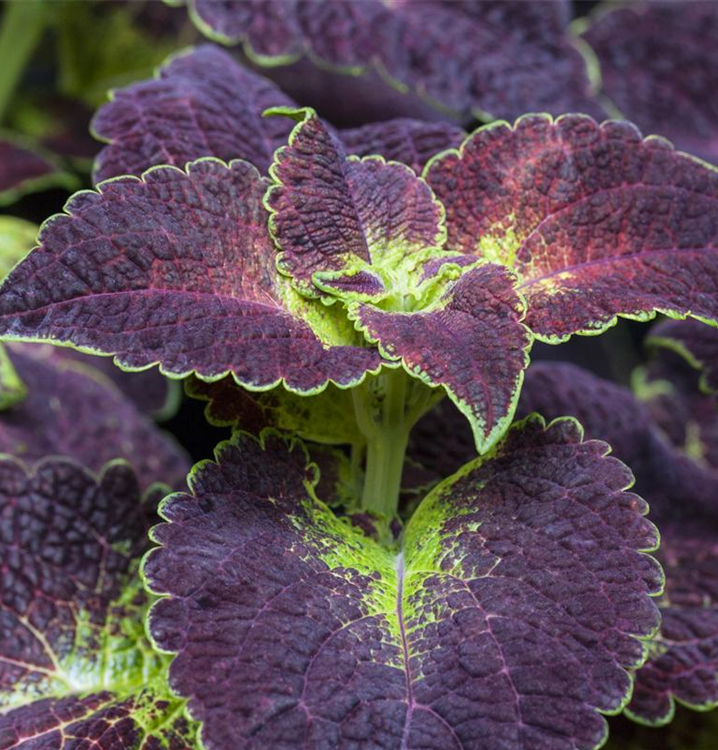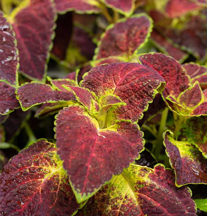 Hoher Blattschmuckwert. Die Blätter der Ziernessel 'Dipt in Wine' sind dunkelrot, spitz eiförmig, gebuchtet und weisen einen hellgrünen Rand auf.