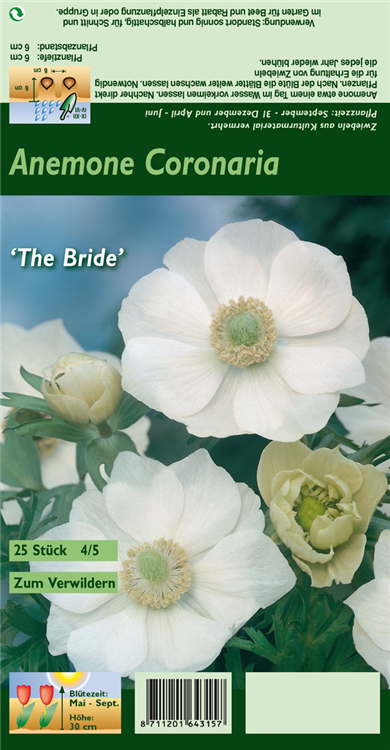 Die beste Pflanzzeit für Anemone coronaria 'De Caen The Bride' ist September - Dezember oder April - Mai.