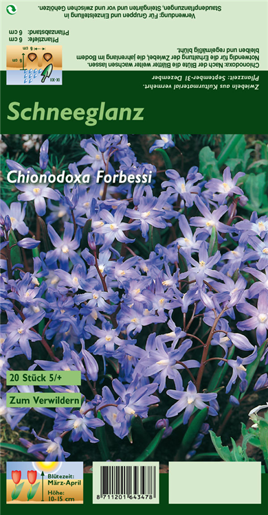 Welch eine Pracht, wenn der Schneeglanz ab März seine herrlichen, blauen Blüten hervorbringt! Über den dunkelgrünen, lanzettlichen Blättern kommen die Blüten besonders gut zur Geltung. Wird Chionodoxa forbesii an einen sonnigen bis halbschattigen Standort mit durchlässigem Boden gepflanzt, entwickelt er sich besonders gut. Ererreicht Größen von 10 cm bis 15 cm bei einer Breite von 5 cm bis 10 cm. Sehr dekorativ macht sich der Schneeglanz auch in Kübeln oder Kästen.