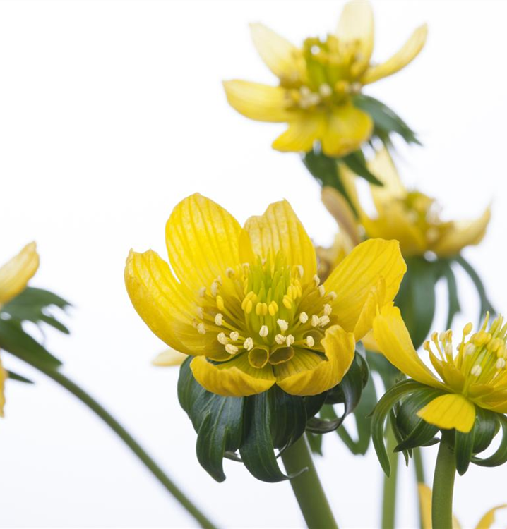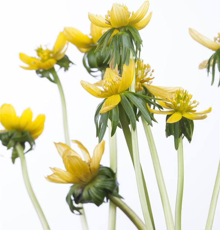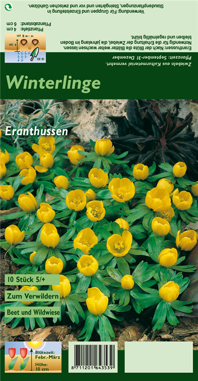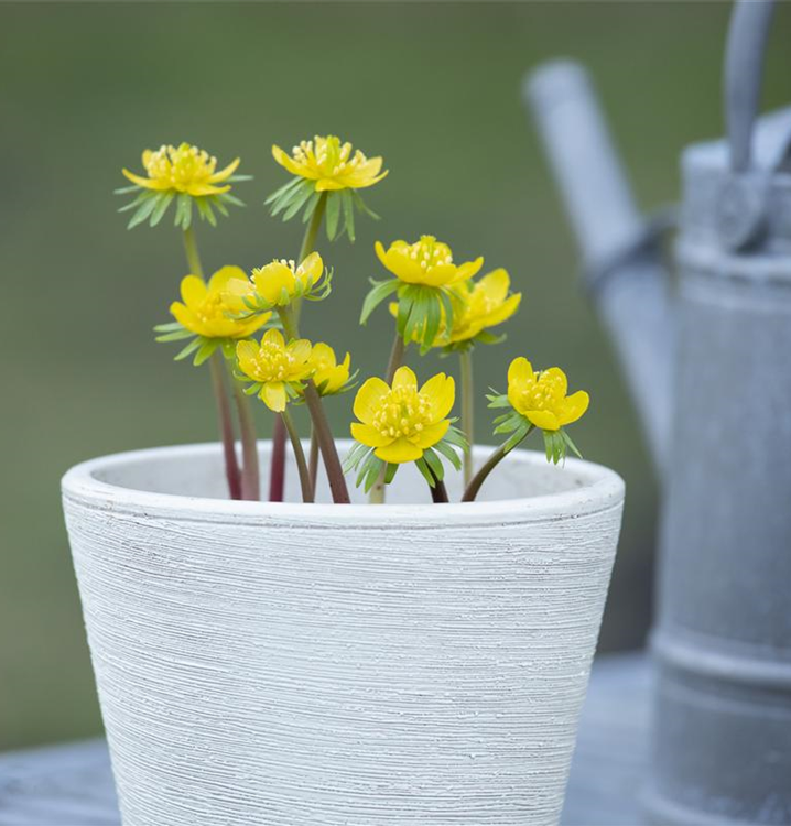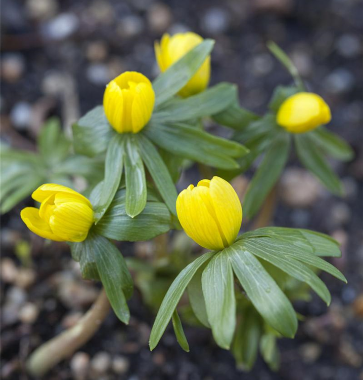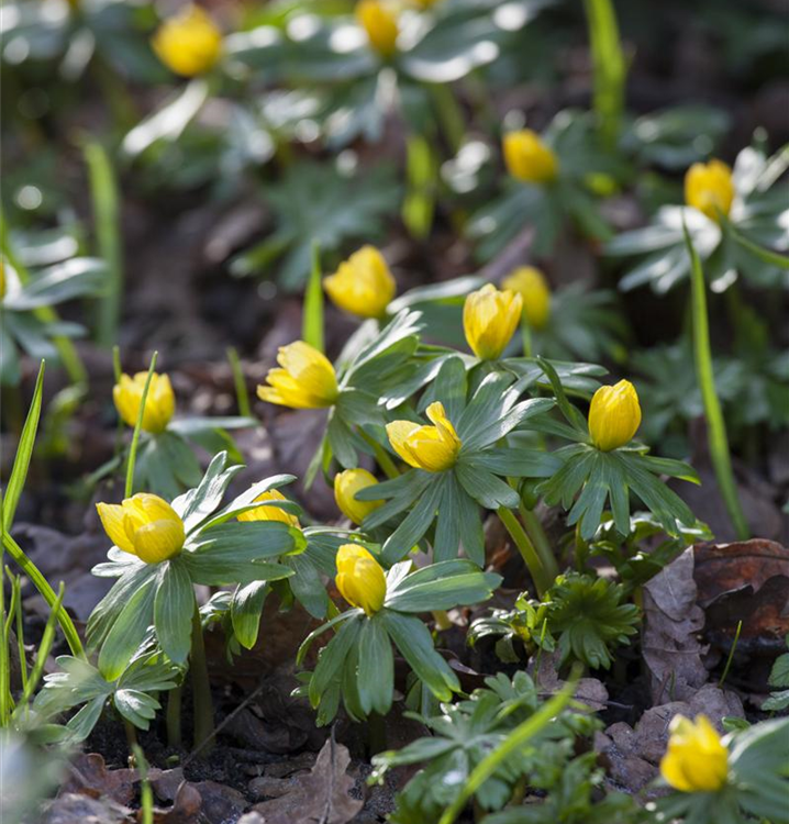 Welch eine Pracht, wenn der Winterling ab Februar seine herrlichen, gelben Blüten hervorbringt! Das Besondere: sie verbreiten einen angenehmen Duft. Über den dunkelgrünen, gefingerten Blättern kommen die Blüten besonders gut zur Geltung. Wird Eranthis hyemalis an einen sonnigen bis halbschattigen Standort mit kalkhaltigem und lehmigem Boden gepflanzt, entwickelt er sich besonders gut. Er wächst flach und erreicht Größen von 6 cm bis 10 cm bei einer Breite von 3 cm bis 5 cm. Sehr dekorativ macht sich der Winterling auch in Kübeln oder Kästen.