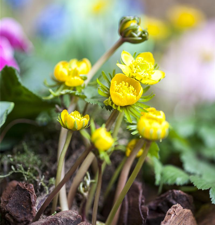 Zusammengepflanzt mit Frühlings-Knotenblume, Sibirischer Blaustern und Kleines Schneeglöckchen bildet der Winterling einen harmonischen Anblick.