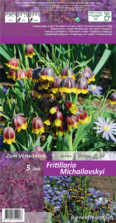 Welch eine Pracht, wenn die Türkische Schachbrettblume ab April ihre herrlichen, purpurrot-gelben, glockenförmigen Blüten hervorbringt! Über den mittelgrünen, linealen Blättern kommen die Blüten besonders gut zur Geltung. Wird Fritillaria michailovskyi an einen sonnigen bis halbschattigen Standort mit durchlässigem und nährstoffreichem Boden gepflanzt, entwickelt sie sich besonders gut. Sie wächst aufrecht und erreicht Größen von 15 cm bis 20 cm bei einer Breite von 6 cm bis 8 cm. Sehr dekorativ macht sich die Türkische Schachbrettblume auch in Kübeln oder Kästen. Fritillaria michailovskyi hat sich als besonders pflegeleicht erwiesen.