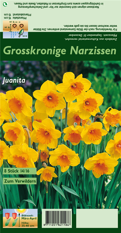 Welch eine Pracht, wenn die Großkronige Narzisse 'Juanita' ab März ihre herrlichen, gelb-orangenen, radförmigen oder röhrenförmigen Blüten hervorbringt! Das Besondere: sie verbreiten einen angenehmen Duft. Über den dunkelgrünen, linealen Blättern kommen die Blüten besonders gut zur Geltung. Wird Narcissus 'Juanita' an einen sonnigen bis halbschattigen Standort mit durchlässigem, lockerem und nährstoffreichem Boden gepflanzt, entwickelt sie sich besonders gut. Sie wächst aufrecht und erreicht Größen von 30 cm bis 45 cm bei einer Breite von 10 cm bis 15 cm. Sehr dekorativ macht sich die Großkronige Narzisse 'Juanita' auch in Kübeln oder Kästen.