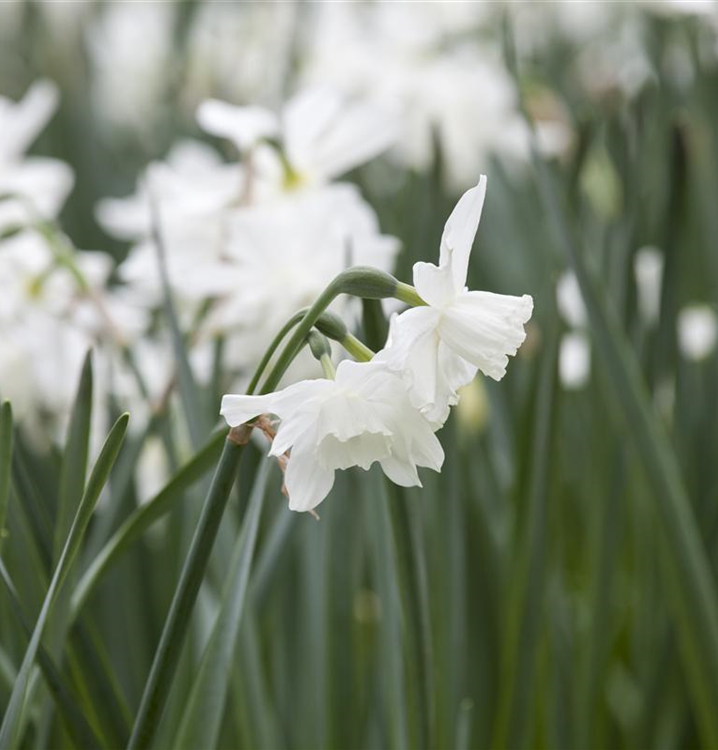 Zwischen April und Mai lässt die Triandus-Narzisse 'Thalia' ihre Blüten in Weiß erstrahlen und ihren angenehmen Duft verbreiten. Die radförmigen oder röhrenförmigen Blüten sind in Trauben angeordnet.