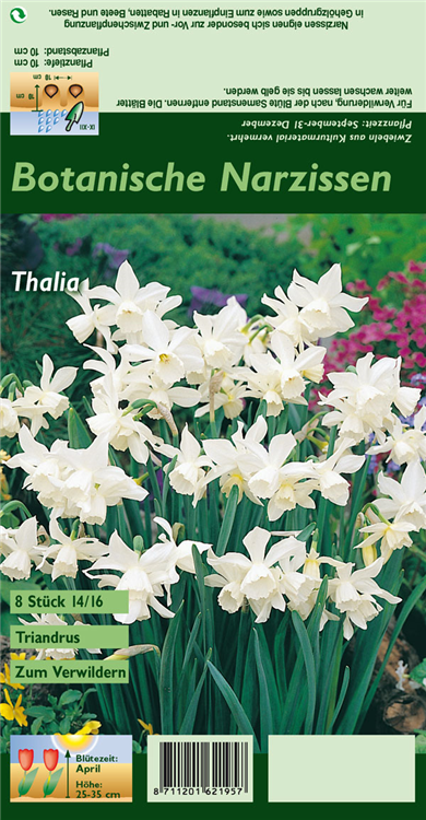 Welch eine Pracht, wenn die Triandus-Narzisse 'Thalia' ab April ihre herrlichen, weißen, radförmigen oder röhrenförmigen Blüten hervorbringt! Das Besondere: sie verbreiten einen angenehmen Duft. Über den dunkelgrünen, linealen Blättern kommen die Blüten besonders gut zur Geltung. Wird Narcissus triandrus 'Thalia' an einen sonnigen bis halbschattigen Standort mit durchlässigem, lockerem und nährstoffreichem Boden gepflanzt, entwickelt sie sich besonders gut. Sie wächst aufrecht und erreicht Größen von 25 cm bis 35 cm bei einer Breite von 10 cm bis 15 cm. Sehr dekorativ macht sich die Triandus-Narzisse 'Thalia' auch in Kübeln oder Kästen.
