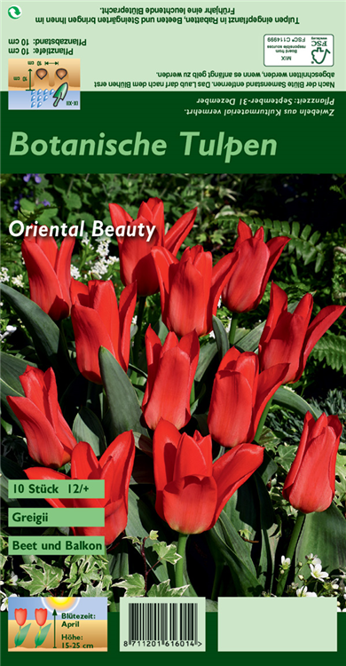 Welch eine Pracht, wenn die Greigii-Tulpe 'Oriental Beauty' ab April ihre herrlichen, roten Blüten hervorbringt! Das Besondere: sie verbreiten einen angenehmen Duft. Über den dunkelgrünen, linealen Blättern kommen die Blüten besonders gut zur Geltung. Wird Tulipa greigii 'Oriental Beauty' an einen sonnigen Standort mit durchlässigem, lockerem und nährstoffreichem Boden gepflanzt, entwickelt sie sich besonders gut. Sie wächst aufrecht, schlank und erreicht Größen von 15 cm bis 25 cm bei einer Breite von 8 cm bis 10 cm. Sehr dekorativ macht sich die Greigii-Tulpe 'Oriental Beauty' auch in Kübeln oder Kästen.