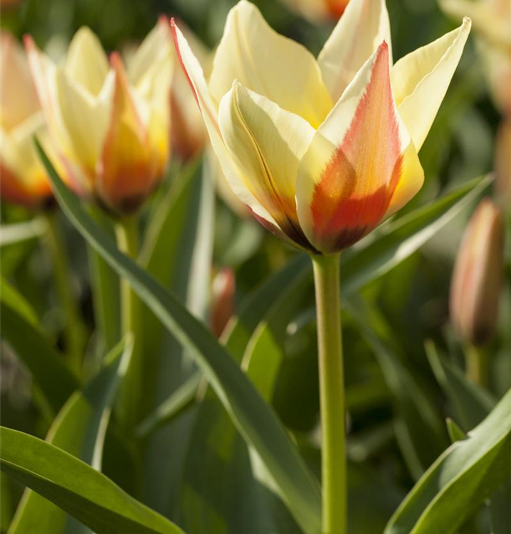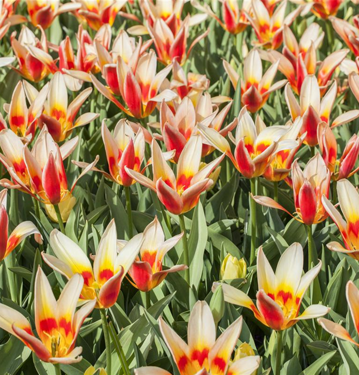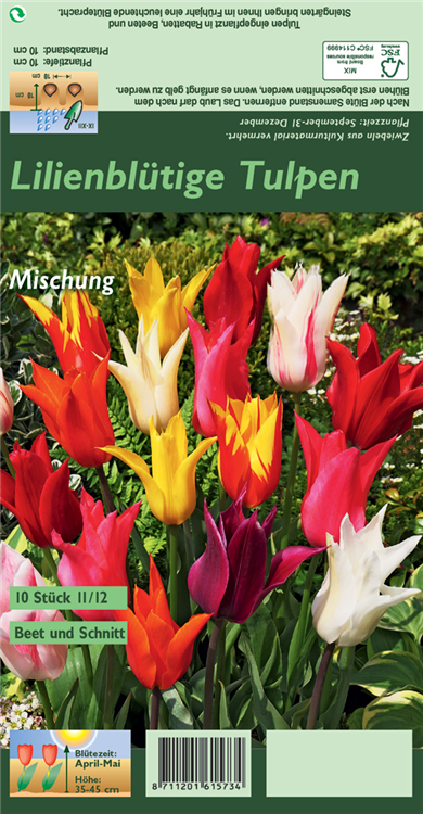 Welch eine Pracht, wenn die Lilienblütige Tulpe ab April ihre herrlichen, bunten Blüten hervorbringt! Das Besondere: sie verbreiten einen angenehmen Duft. Über den dunkelgrünen, linealen Blättern kommen die Blüten besonders gut zur Geltung. Wird Tulipa lilienblütig an einen sonnigen Standort mit durchlässigem, lockerem und nährstoffreichem Boden gepflanzt, entwickelt sie sich besonders gut. Sie wächst schlank, aufrecht und erreicht Größen von 50 cm bis 55 cm bei einer Breite von 8 cm bis 10 cm. Sehr dekorativ macht sich die Lilienblütige Tulpe auch in Kübeln oder Kästen.