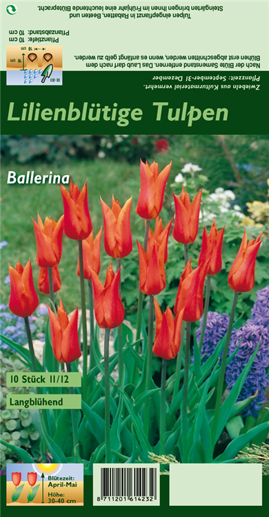 Welch eine Pracht, wenn die Lilienblütige Tulpe 'Ballerina' ab April ihre herrlichen, orangefarbenen Blüten hervorbringt! Das Besondere: sie verbreiten einen angenehmen Duft. Über den dunkelgrünen, linealen Blättern kommen die Blüten besonders gut zur Geltung. Wird Tulipa 'Ballerina' an einen sonnigen Standort mit durchlässigem, lockerem und nährstoffreichem Boden gepflanzt, entwickelt sie sich besonders gut. Sie wächst aufrecht, schlank und erreicht Größen von 35 cm bis 45 cm bei einer Breite von 8 cm bis 10 cm. Sehr dekorativ macht sich die Lilienblütige Tulpe 'Ballerina' auch in Kübeln oder Kästen.