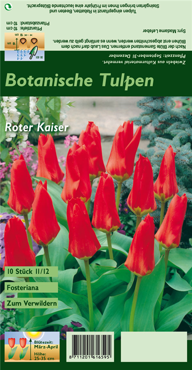 Welch eine Pracht, wenn die Tulpe 'Roter Kaiser' ab März ihre herrlichen, roten Blüten hervorbringt! Das Besondere: sie verbreiten einen angenehmen Duft. Über den dunkelgrünen, linealen Blättern kommen die Blüten besonders gut zur Geltung. Wird Tulipa fosteriana 'Roter Kaiser' an einen sonnigen Standort mit durchlässigem, lockerem und nährstoffreichem Boden gepflanzt, entwickelt sie sich besonders gut. Sie wächst aufrecht, schlank und erreicht Größen von 25 cm bis 35 cm bei einer Breite von 10 cm bis 12 cm. Sehr dekorativ macht sich die Tulpe 'Roter Kaiser' auch in Kübeln oder Kästen.
