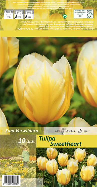 Welch eine Pracht, wenn die Tulpe 'Sweetheart' ab März ihre herrlichen, gelb-weißen Blüten hervorbringt! Das Besondere: sie verbreiten einen angenehmen Duft. Über den dunkelgrünen, linealen Blättern kommen die Blüten besonders gut zur Geltung. Wird Tulipa fosteriana 'Sweetheart' an einen sonnigen Standort mit durchlässigem, lockerem und nährstoffreichem Boden gepflanzt, entwickelt sie sich besonders gut. Sie wächst schlank, aufrecht und erreicht Größen von 25 cm bis 30 cm bei einer Breite von 10 cm bis 12 cm. Sehr dekorativ macht sich die Tulpe 'Sweetheart' auch in Kübeln oder Kästen.