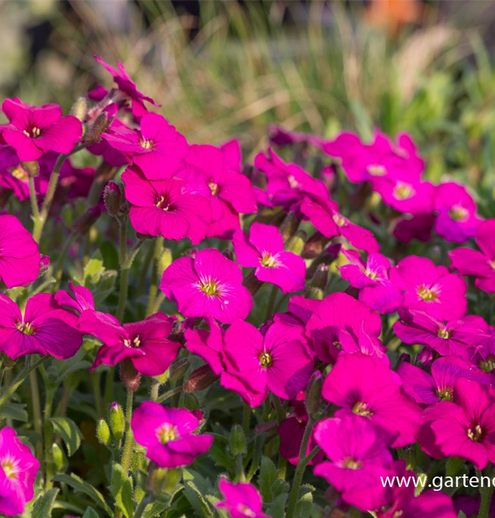 Das Garten-Blaukissen 'Regado Red' (Aubrieta x cultorum) ist eine kissenförmige, polsterbildende immergrüne Staude, die von April bis Mai purpurrote, radförmige Blüten bildet. An einem sonnigen bis halbschattigen Standort mit humosem, nährstoffreichem Boden erreicht es gewöhnlich eine Höhe von ca. 15 cm und wird ca. 30 cm breit. Das Garten-Blaukissen 'Regado Red' ist an geschützten Standorten gut frostverträglich.
