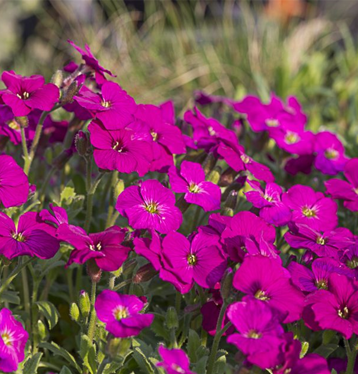 Aubrieta x cultorum 'Regado Red' bildet radförmige, purpurrote Blüten ab April.