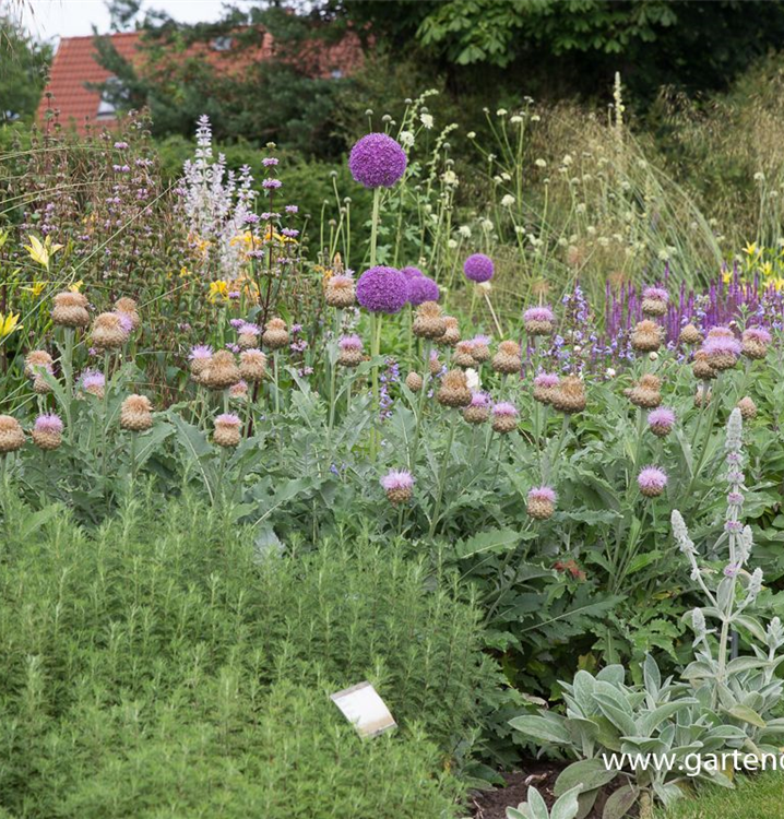 Amberboa muricata bildet während der gesamten Saison zahlreiche körbchenartige, lilafarbene Blüten.