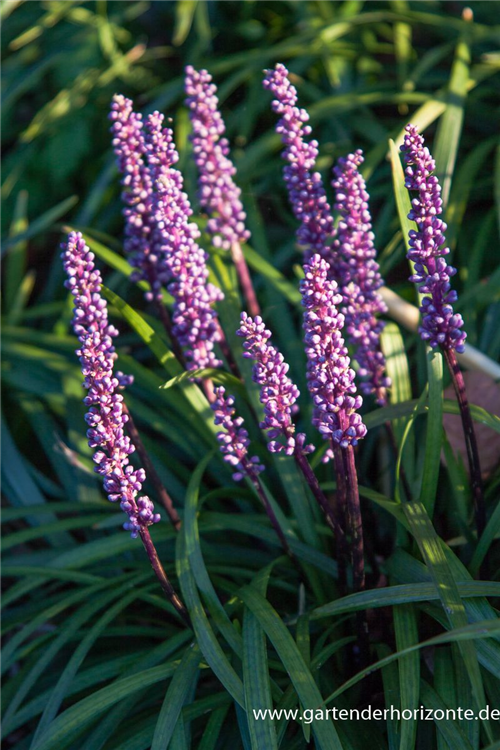 Liriope muscari 'Ingwersen' bildet in Rispen angeordnete, violette Blüten ab August.