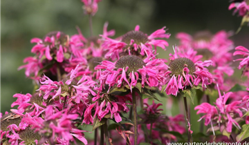 Monarda fistulosa 'Marshall´s Delight' bildet lippenförmige, in Quirlen angeordnete, rosafarbene Blüten ab Juli.