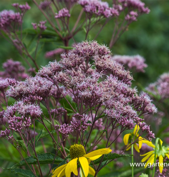 Der Große Garten-Wasserdost 'Phantom'® (Eupatorium fistulosum) ist eine aufrechte Staude, die von August bis September karminrote, in Doldentrauben angeordnete Blüten mit einem angenehmen Duft bildet. An einem sonnigen bis halbschattigen Standort mit durchlässigem, nährstoffreichem Boden erreicht er gewöhnlich eine Höhe von ca. 1 m und wird ca. 60 cm breit. Der Große Garten-Wasserdost 'Phantom'® ist gut frostverträglich.