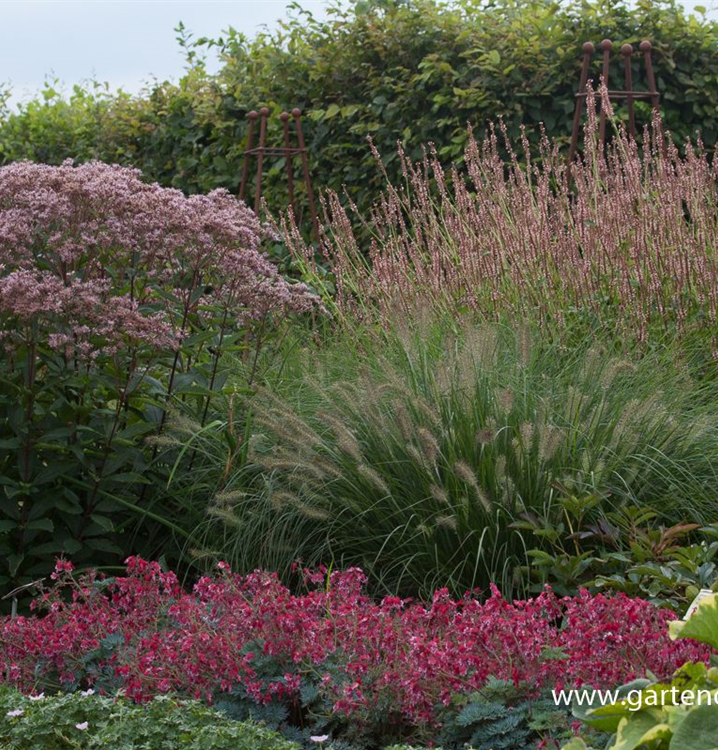 Eupatorium fistulosum 'Phantom'® bildet in Doldentrauben angeordnete, karminrote Blüten ab August. Diese verströmen einen angenehmen Duft.