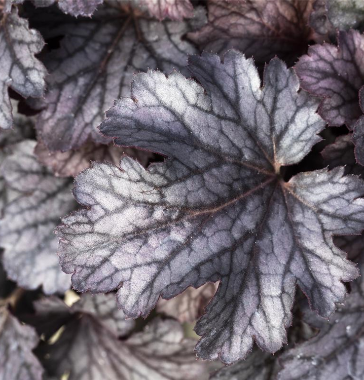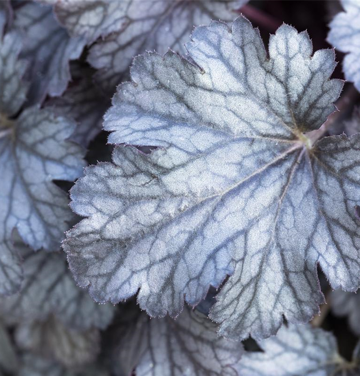 Hoher Blattschmuckwert. Die wintergrünen Blätter des Purpurglöckchens 'Cinnabar Silver' sind silbergrau, dunkelrot, rundlich, gekerbt.