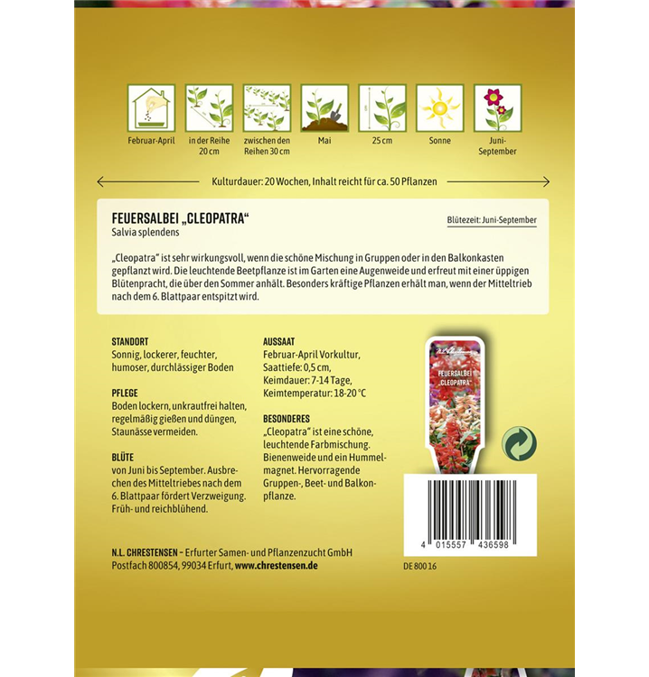 Der Feuersalbei 'Cleopatra' (Salvia splendens) ist eine beliebte Pflanze für den Balkon, die während der gesamten Saison unzählige rote, violette, cremeweiße Blüten bildet. Die dunkelgrünen Blätter sind eiförmig. Ein sonniger Standort und ein durchlässiges Substrat werden bevorzugt.