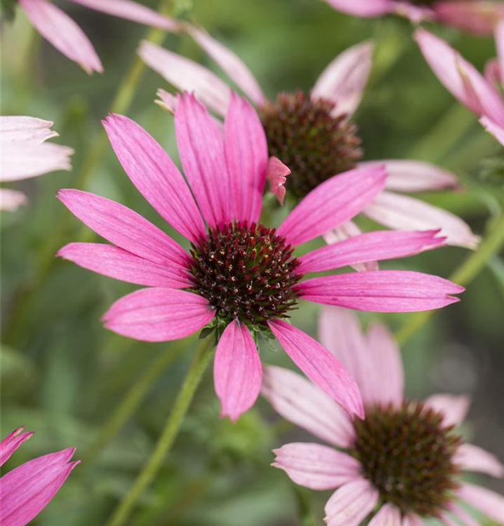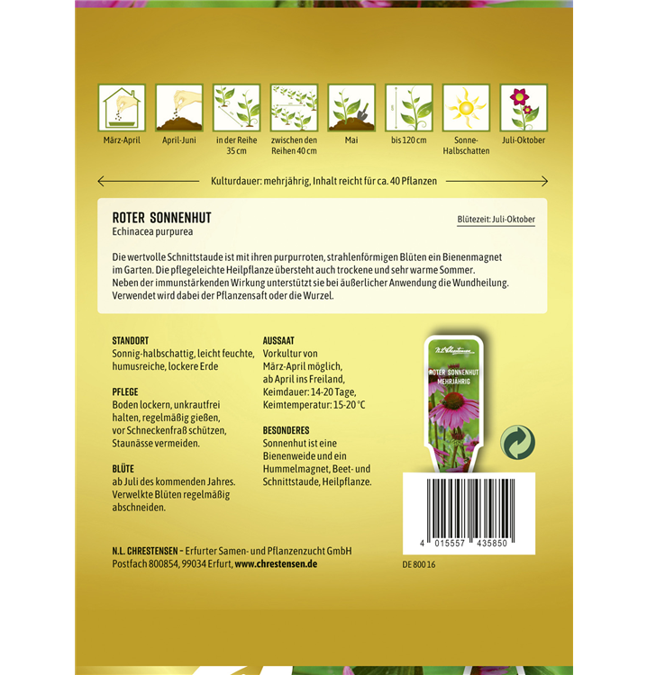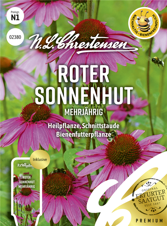 Der Purpursonnenhut (Echinacea purpurea) ist eine aufrechte Staude, die von Juli bis September rote, körbchenartige Blüten bildet. An einem sonnigen Standort mit durchlässigem, humosem Boden erreicht er gewöhnlich eine Höhe von ca. 80 cm und wird ca. 40 cm breit. Der Purpursonnenhut ist gut frostverträglich.
