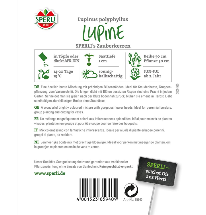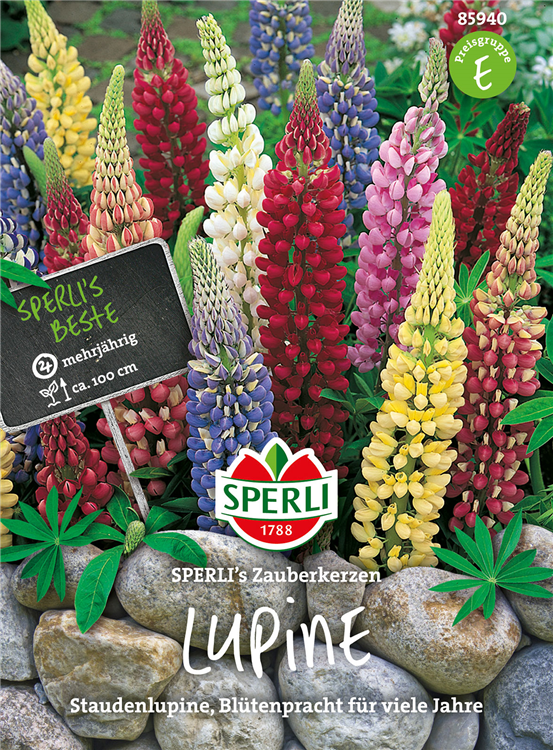 Die Garten-Lupine 'Zauberkerze' (Lupinus polyphyllus) ist eine buschige, aufrechte Staude, die von Juni bis September bunte Blüten mit einem angenehmen Duft bildet. An einem sonnigen Standort mit durchlässigem, kalkfreiem Boden erreicht sie gewöhnlich eine Höhe von ca. 1 m und wird ca. 60 cm breit. Die Garten-Lupine 'Zauberkerze' ist gut frostverträglich.