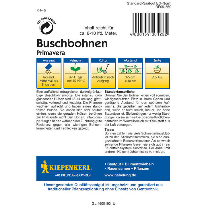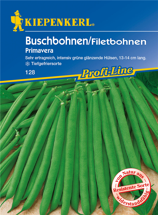 Die Busch-Bohne 'Primavera' (Phaseolus vulgaris) bildet Hülsenfrüchte, die aromatisch schmecken und bereits ab September geerntet werden können. Für das optimale Wachstum der Busch-Bohne 'Primavera' werden ein sonniger Standort und durchlässiger, nährstoffreicher Boden benötigt.
