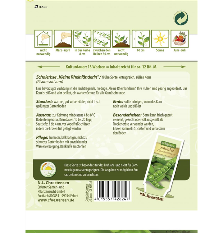 Die Schal-Erbse 'Kleine Rheinländerin' (Pisum sativum) bildet Samenkörner, die süß, mehlig schmecken und bereits ab Juni geerntet werden können. Für das optimale Wachstum der Schal-Erbse 'Kleine Rheinländerin' werden ein sonniger Standort und durchlässiger, nährstoffreicher Boden benötigt.