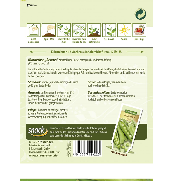 Die Markerbse 'Remus' (Pisum sativum) bildet Samenkörner, die süß, aromatisch schmecken und bereits ab Juli geerntet werden können. Für das optimale Wachstum der Markerbse 'Remus' werden ein sonniger Standort und durchlässiger, nährstoffreicher Boden benötigt.