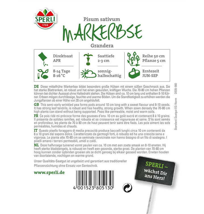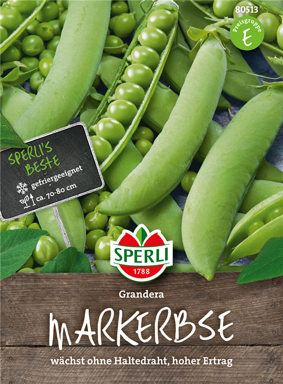 Die Markerbse 'Grandera' (Pisum sativum) bildet Hülsenfrüchte, die süß, aromatisch schmecken und bereits ab Juni geerntet werden können. Für das optimale Wachstum der Markerbse 'Grandera' werden ein sonniger Standort und durchlässiger, nährstoffreicher Boden benötigt.