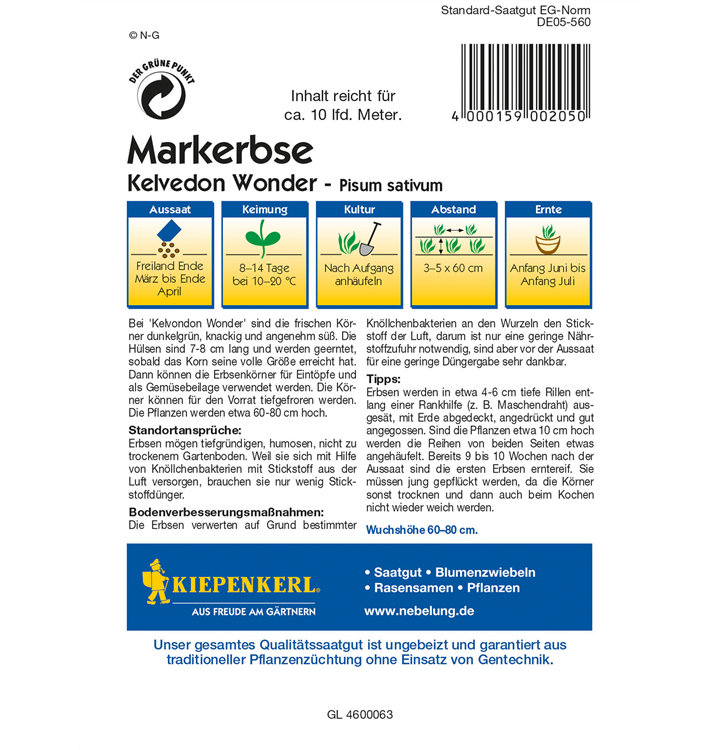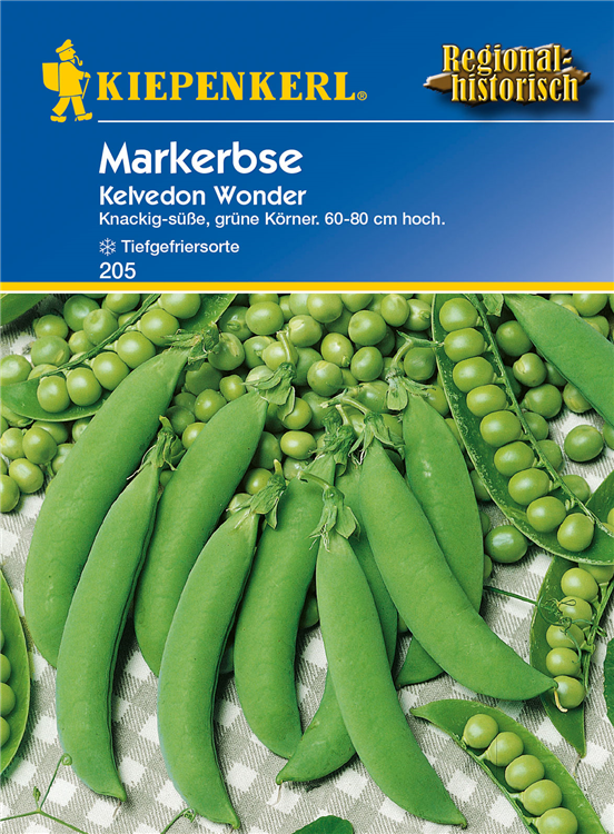 Die Markerbse 'Wunder von Kelvedon' (Pisum sativum) bildet Samenkörner, die süß, aromatisch schmecken und bereits ab Juni geerntet werden können. Für das optimale Wachstum der Markerbse 'Wunder von Kelvedon' werden ein sonniger Standort und durchlässiger, nährstoffreicher Boden benötigt.