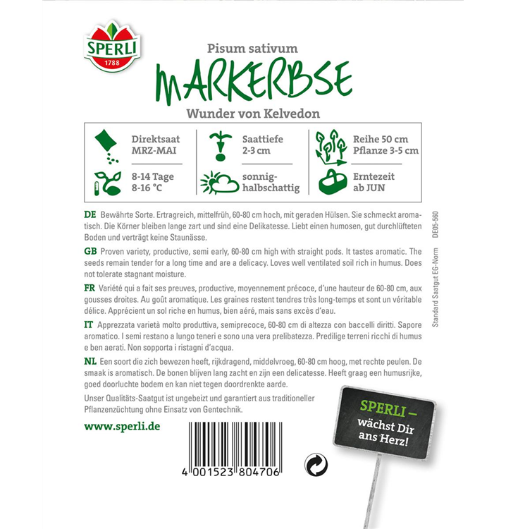 Die Markerbse 'Wunder von Kelvedon' (Pisum sativum) bildet Samenkörner, die süß, aromatisch schmecken und bereits ab Juni geerntet werden können. Für das optimale Wachstum der Markerbse 'Wunder von Kelvedon' werden ein sonniger Standort und durchlässiger, nährstoffreicher Boden benötigt.
