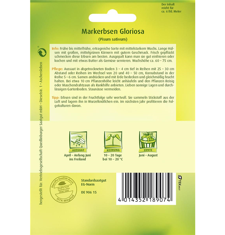 Die Mark-Erbse 'Gloriosa' (Pisum sativum) bildet Samenkörner, die süß, aromatisch schmecken und bereits ab Juni geerntet werden können. Für das optimale Wachstum der Mark-Erbse 'Gloriosa' werden ein sonniger Standort und durchlässiger, nährstoffreicher Boden benötigt.