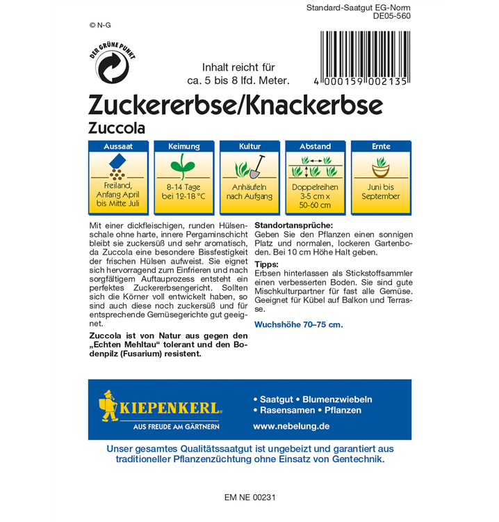 Die Zuckererbse 'Zuccola' (Pisum sativum) bildet Hülsenfrüchte, die süß schmecken und bereits ab Juni geerntet werden können. Für das optimale Wachstum der Zuckererbse 'Zuccola' werden ein sonniger Standort und durchlässiger, nährstoffreicher Boden benötigt.