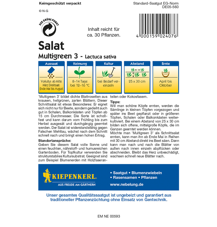 Samen 0,5 - 1 cm mit Erde bedecken. Die Keimung erfolgt innerhalb von 8 - 14 Tagen bei 12 - 16°C Bodentemperatur.