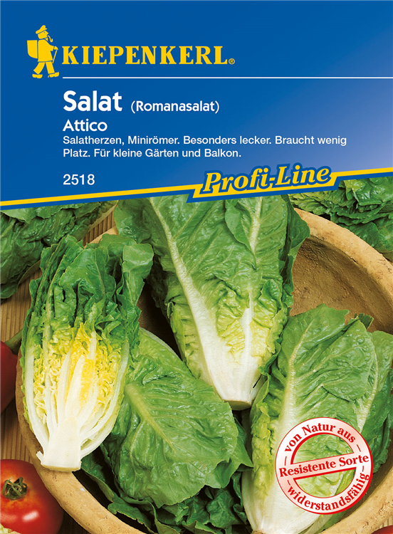 Der Romanasalat 'Attico' (Lactuca sativa) ist eine aromatisch schmeckende Gemüsepflanze. Seine Blätter können geerntet werden, sobald er ca. 20 erreicht hat. Für das optimale Wachstum des Romanasalats 'Attico' werden ein sonniger Standort und durchlässiger, nährstoffreicher Boden benötigt.