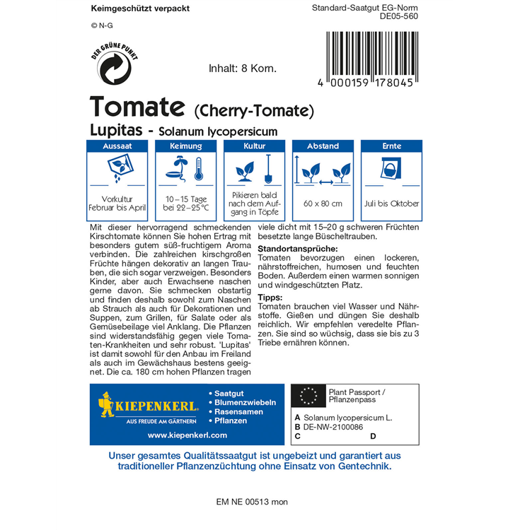 Samen 0,5 - 1 cm mit Erde bedecken. Die Keimung erfolgt innerhalb von 6 - 10 Tagen bei 15°C Bodentemperatur.