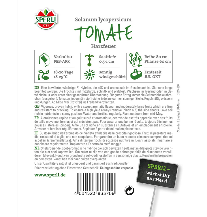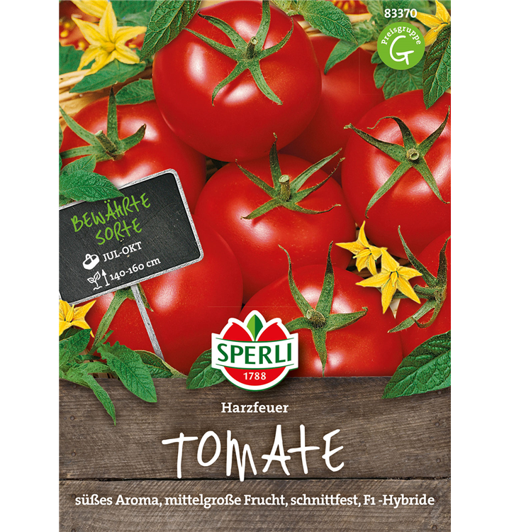 Die Tomate 'Harzfeuer F1' (Solanum lycopersicum) bildet mittelgroße Früchte, die aromatisch, würzig schmecken und bereits ab Juli geerntet werden können. Für das optimale Wachstum der Tomate 'Harzfeuer F1' werden ein sonniger Standort und durchlässiger, nährstoffreicher Boden benötigt.