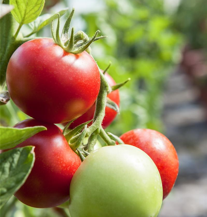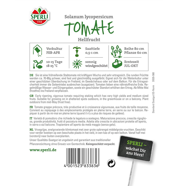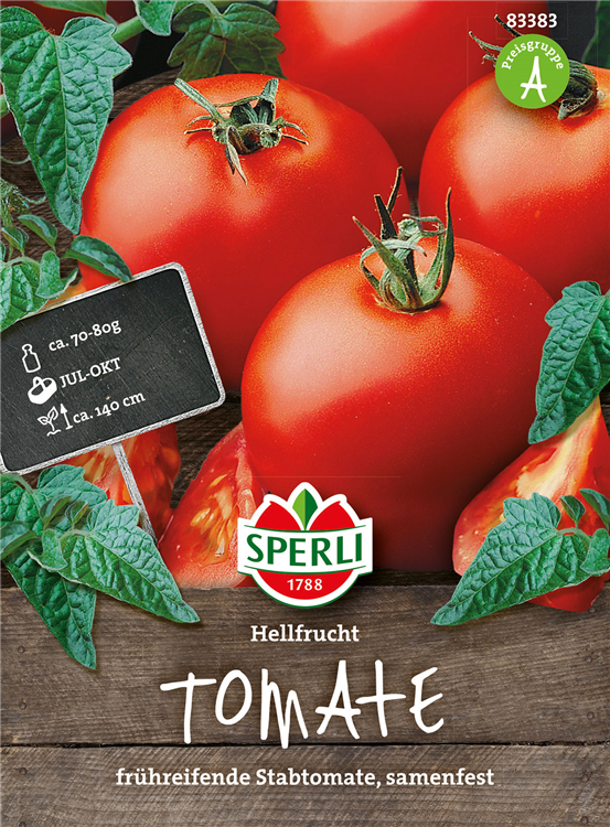 Die Tomate 'Hellfrucht' (Solanum lycopersicum) bildet Früchte, die aromatisch schmecken und bereits ab Juli geerntet werden können. Für das optimale Wachstum der Tomate 'Hellfrucht' werden ein sonniger Standort und durchlässiger, nährstoffreicher Boden benötigt.