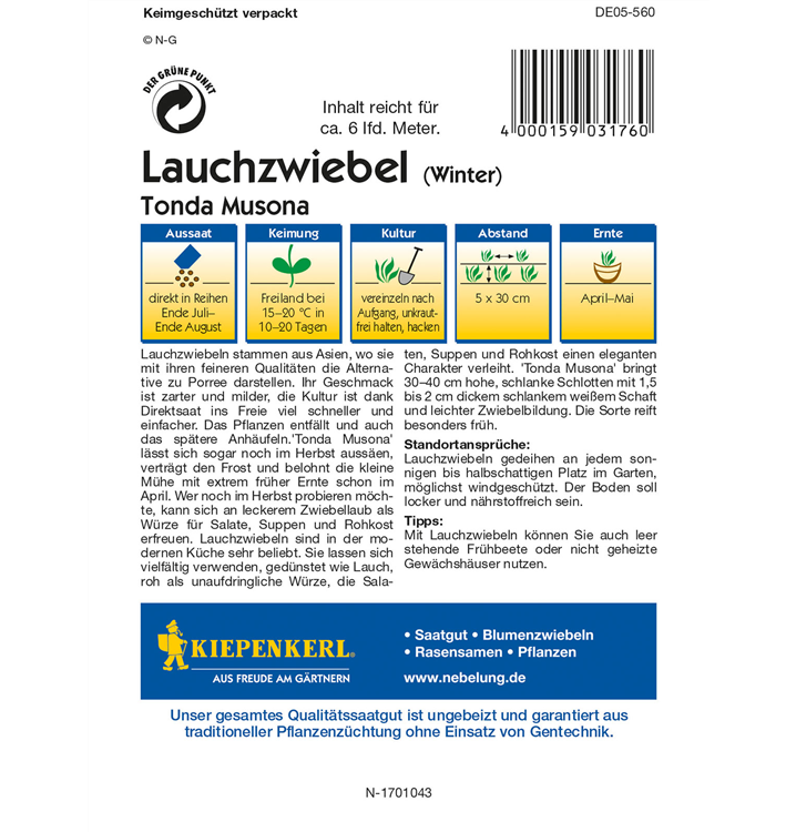 Die Winterlauchzwiebel 'Tonda Musona' (Allium cepa) ist eine würzig schmeckende Gemüsepflanze. Ihre Blätter können geerntet werden, sobald sie ca. 30 erreicht hat. Für das optimale Wachstum der Winterlauchzwiebel 'Tonda Musona' werden ein sonniger Standort und durchlässiger, nährstoffreicher Boden benötigt.