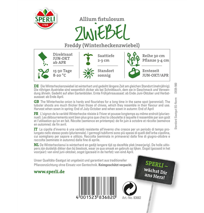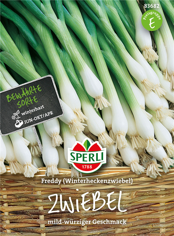 Die Winterzwiebel 'Freddy' (Allium fistulosum) ist eine Kräuterpflanze mit einem aromatischen, würzigen, milden Geschmack. Ihre grau-grünen Blätter sind rundlich. Für das optimale Wachstum der Winterzwiebel 'Freddy' werden ein sonniger Standort und durchlässiger, nährstoffreicher Boden benötigt.