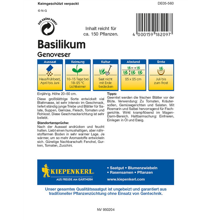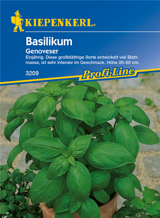 Das Garten-Basilikum 'Genoveser' (Ocimum basilicum) ist eine Kräuterpflanze mit einem würzigen Geschmack. Seine dunkelgrünen, glänzenden Blätter sind eiförmig und gewellt. Für das optimale Wachstum des Garten-Basilikums 'Genoveser' werden ein sonniger Standort und durchlässiger, nährstoffreicher Boden benötigt.