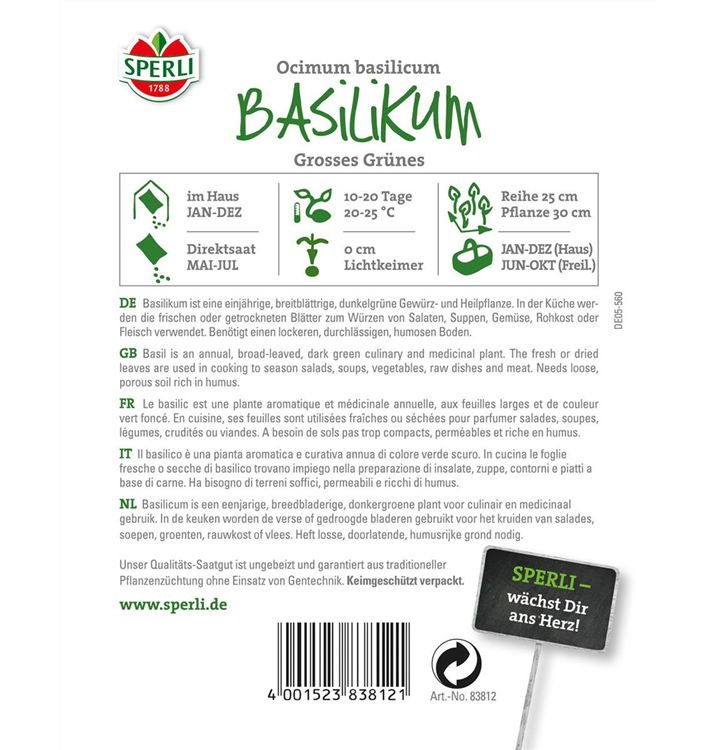 Das Garten-Basilikum 'Großes Grünes' (Ocimum basilicum) ist eine Kräuterpflanze mit einem würzigen Geschmack. Seine dunkelgrünen Blätter sind eiförmig und gewellt. Für das optimale Wachstum des Garten-Basilikums 'Großes Grünes' werden ein sonniger Standort und durchlässiger, nährstoffreicher Boden benötigt.