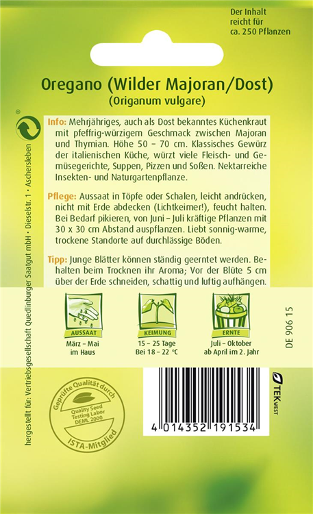 Der Oregano (Origanum vulgare) ist eine angenehm duftende Kräuterpflanze mit einem aromatischen, würzigen Geschmack. Seine mittelgrünen Blätter sind eiförmig, lanzettlich und gewellt, bewimpert. Für das optimale Wachstum des Oreganos werden ein sonniger Standort und durchlässiger, nährstoffreicher Boden benötigt.
