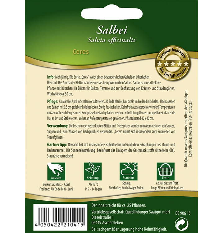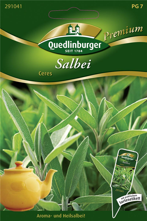 Der Garten-Salbei 'Ceres' (Salvia officinalis) ist eine angenehm duftende Kräuterpflanze mit einem aromatischen, erfrischenden Geschmack. Seine grau-grünen, behaarten Blätter sind lanzettlich. Für das optimale Wachstum des Garten-Salbeis 'Ceres' werden ein sonniger Standort und durchlässiger, nährstoffreicher Boden benötigt.